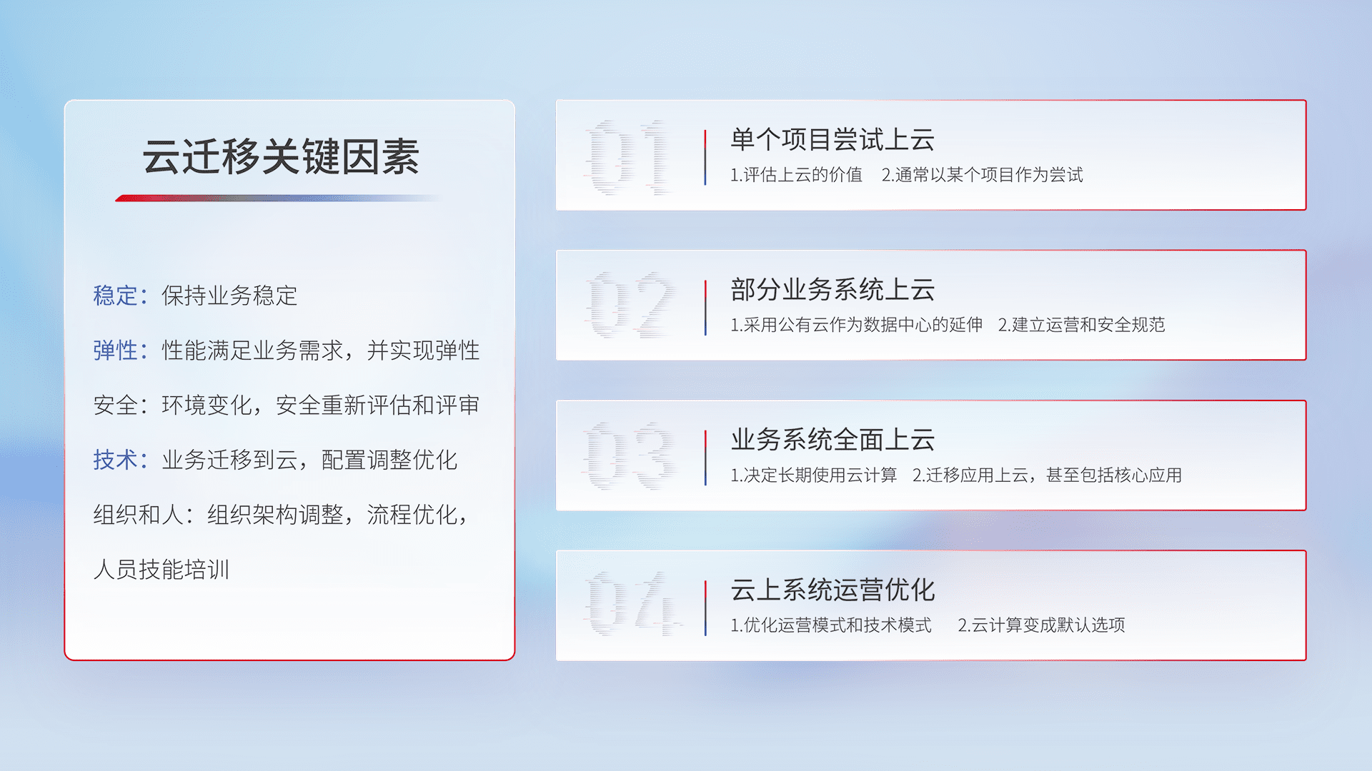 结合实际业务,,从规划设计、、云平台选型、、云原生改造、、、、数据迁移、、集成交付,,迁移全过程为客户识别最佳上云路径,,,做好风险识别管理,,,设计网络架构、、身份权限、、、、安全审计合规、、、、操作审计、、、日志审计、、监控告警策略、、、多站点容灾设计等,,,对云上基础设施进行整体规划,,,,提升IT治理水平,,以满足弹性、、、、高可用、、高性能的需求。。