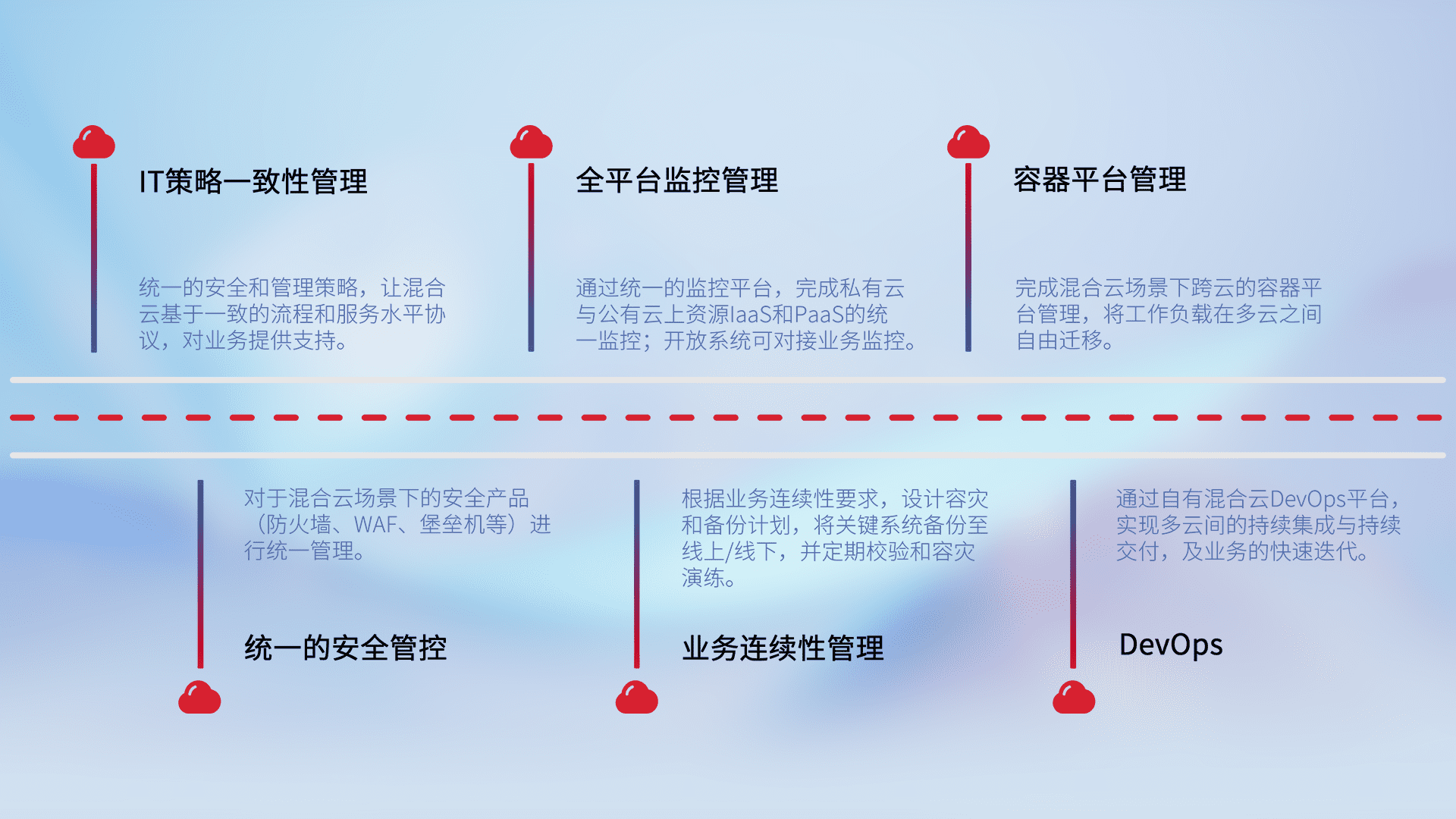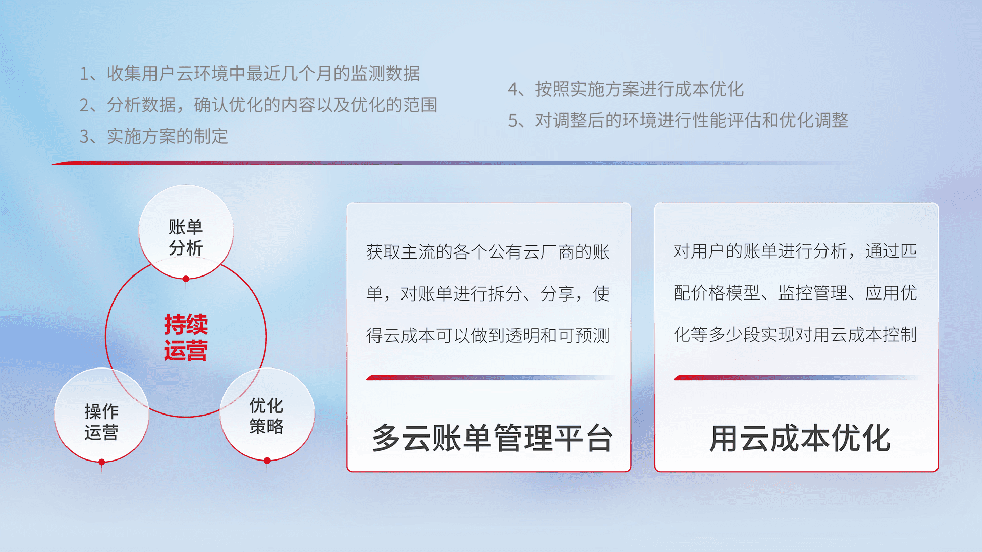 通过多云纳管,,,以统一的资源数据模型把客户的云资源进行抽象和封装,,进而实现对多云资源的统一操作,,保障云资源管理的可靠性、、、稳定性与可用性。。。量身定制化运维内容,,,,配置、、、开发运维、、、补丁管理、、备份、、、监控、、、、认证和访问管理、、、审计和日常巡检等,,,保障在用云过程中的可靠度,,,,稳定度以及高可用率。。