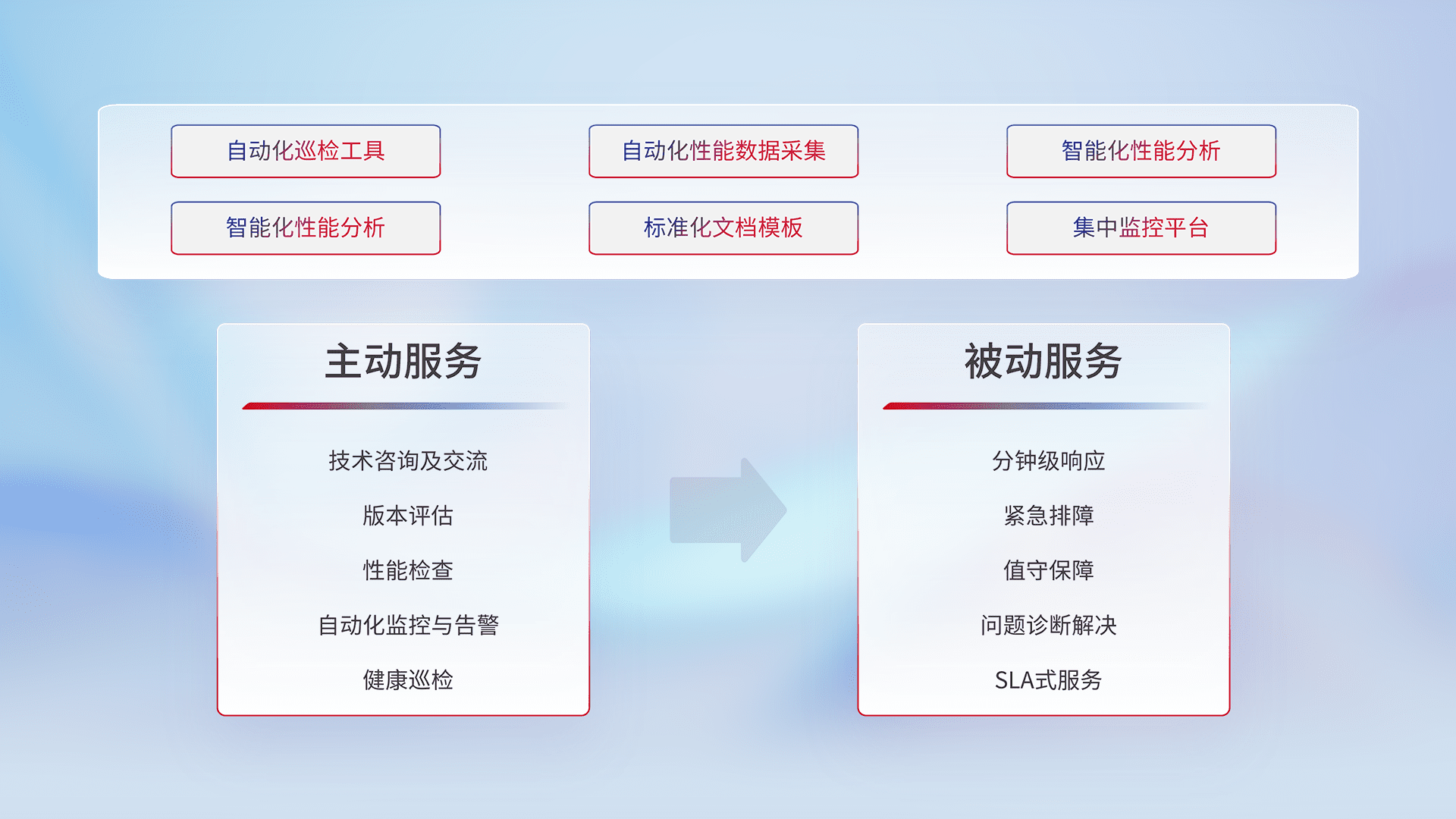 智能化工具和标准化文档,,保障服务质量,,,提供主动服务(包含技术咨询、、、版本评估、、、、性能检查、、自动化监控与告警、、健康巡检)和被动服务包含(分钟级响应、、、紧急排障、、值守保障、、、、问题诊断解决、、SLA服务)。。。